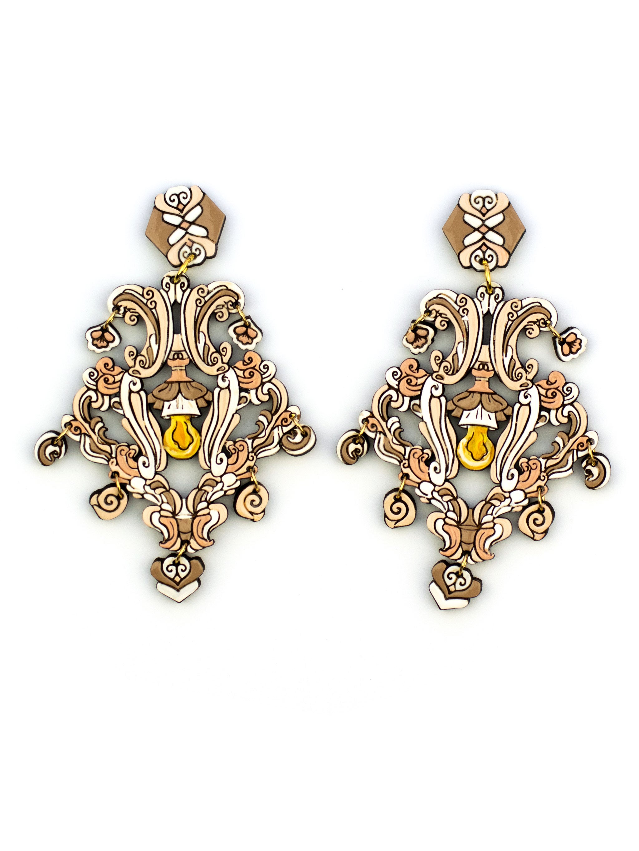 Step into the spotlight with these chandelier earrings straight out of a grand ballroom fantasy. Painted in creamy beige, they dangle and dance with every movement—because elegance should always move. One-of-a-kind and impossibly chic, these beauties redefine what neutral can do.