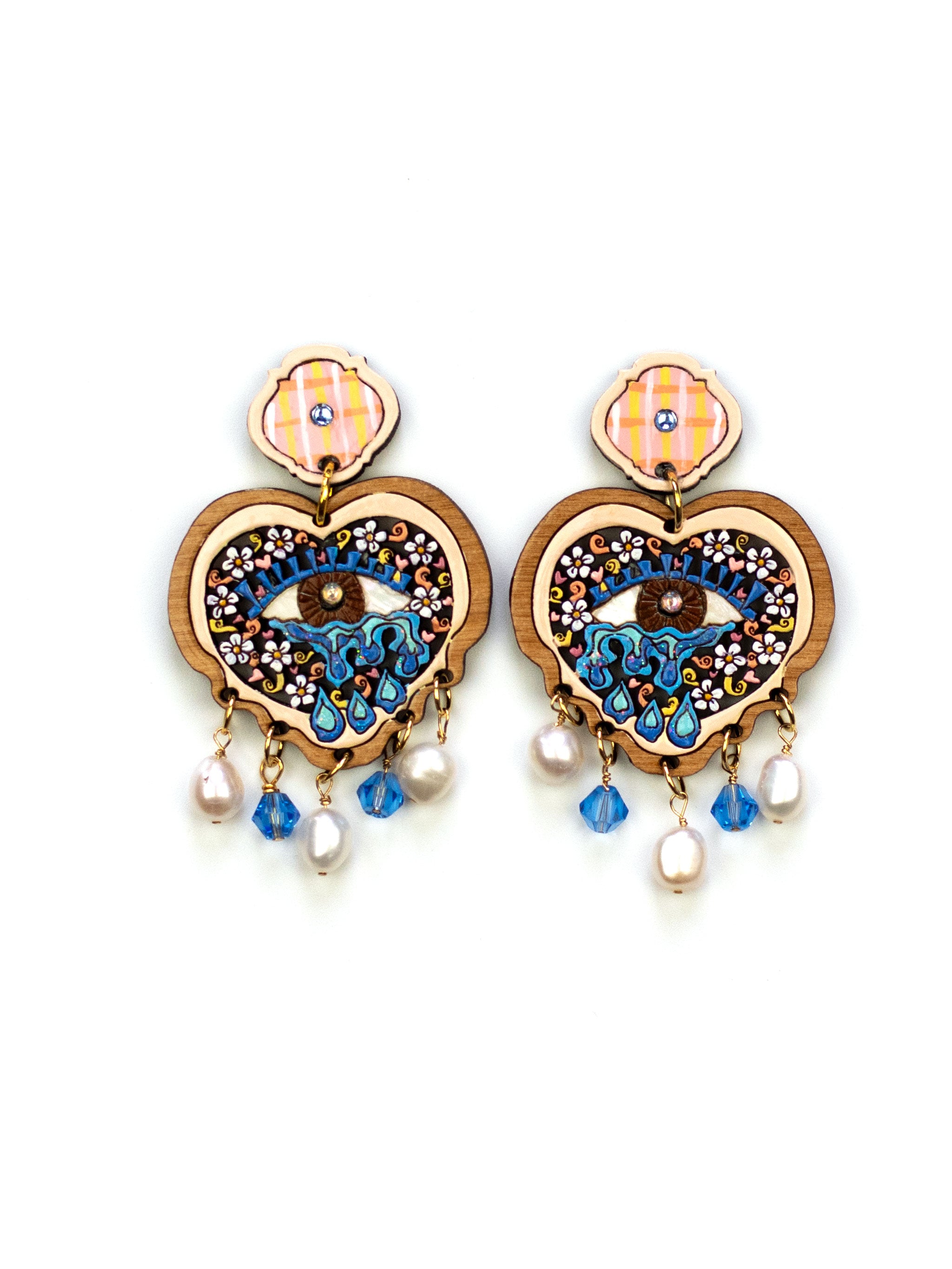 ❤️Meet the Crybaby—a playful reimagining of our beloved classic. These statement earrings showcase an inlaid pearl eye accented with sparkling rhinestones, creating an expressive face that's impossible to ignore. Delicate pearls and glass beads cascade from the bottom, adding movement and dimension to this intricately crafted piece.
