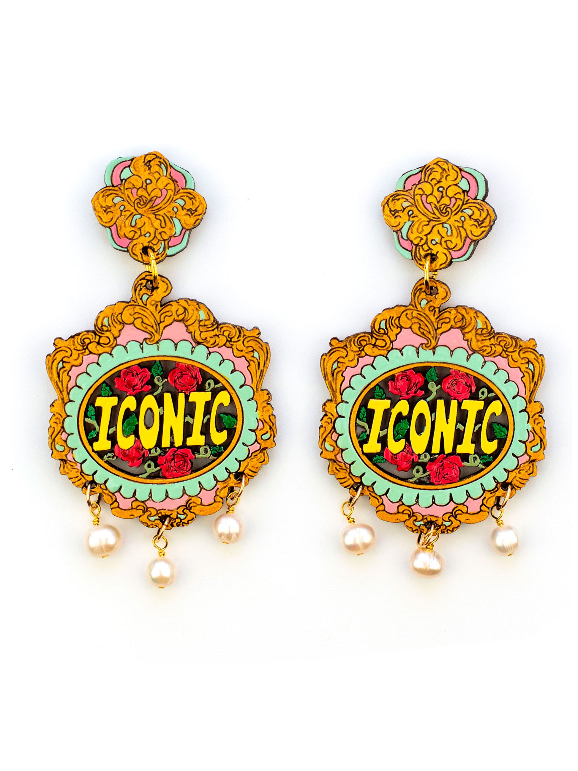 Add a touch of playfulness and glamour to any outfit with our Iconic earrings. Featuring the word ICONIC and three delicate pearls, these earrings are a perfect blend of bold and elegant. The ornate details add a quirky twist to these must-have accessories.