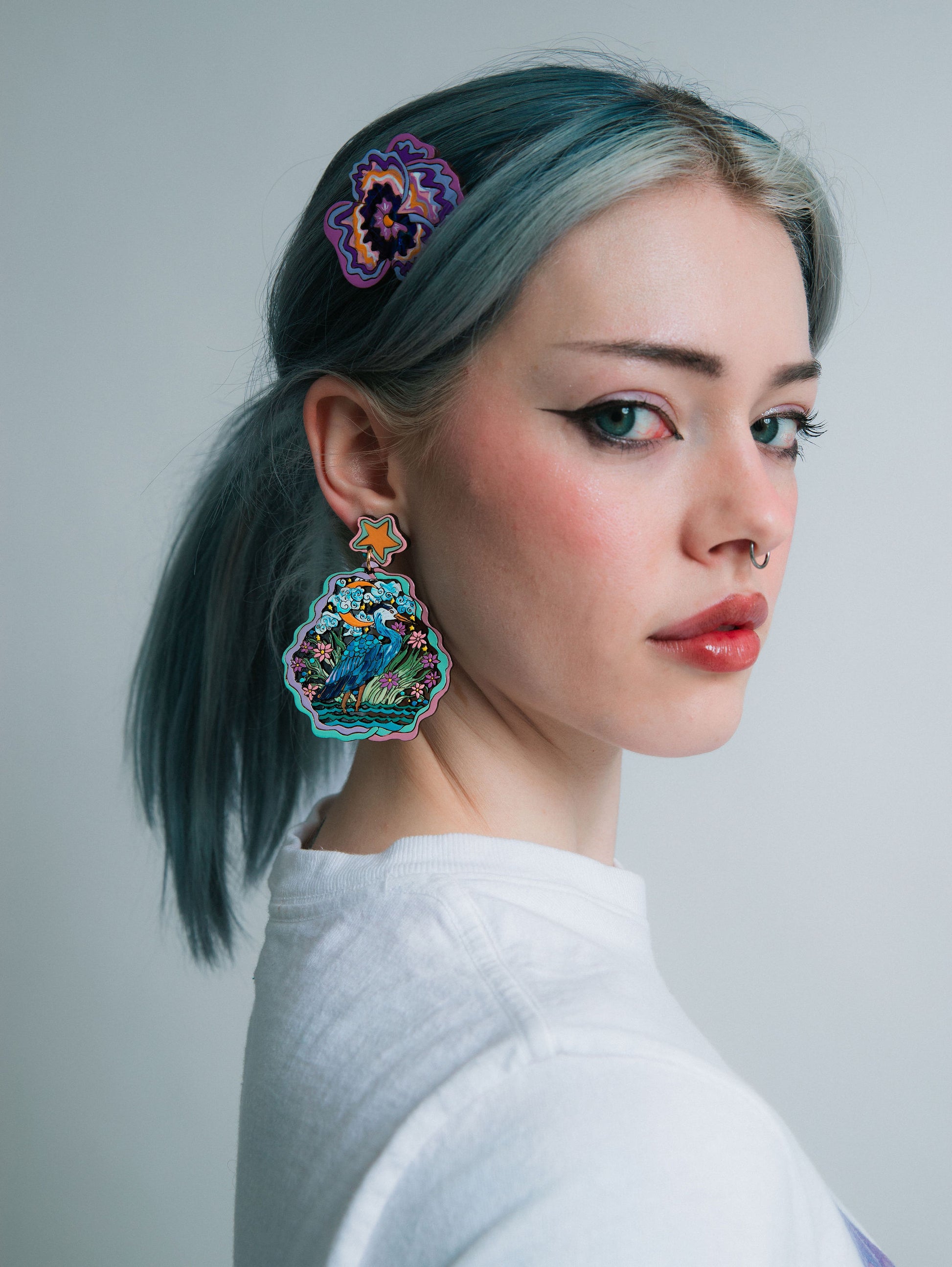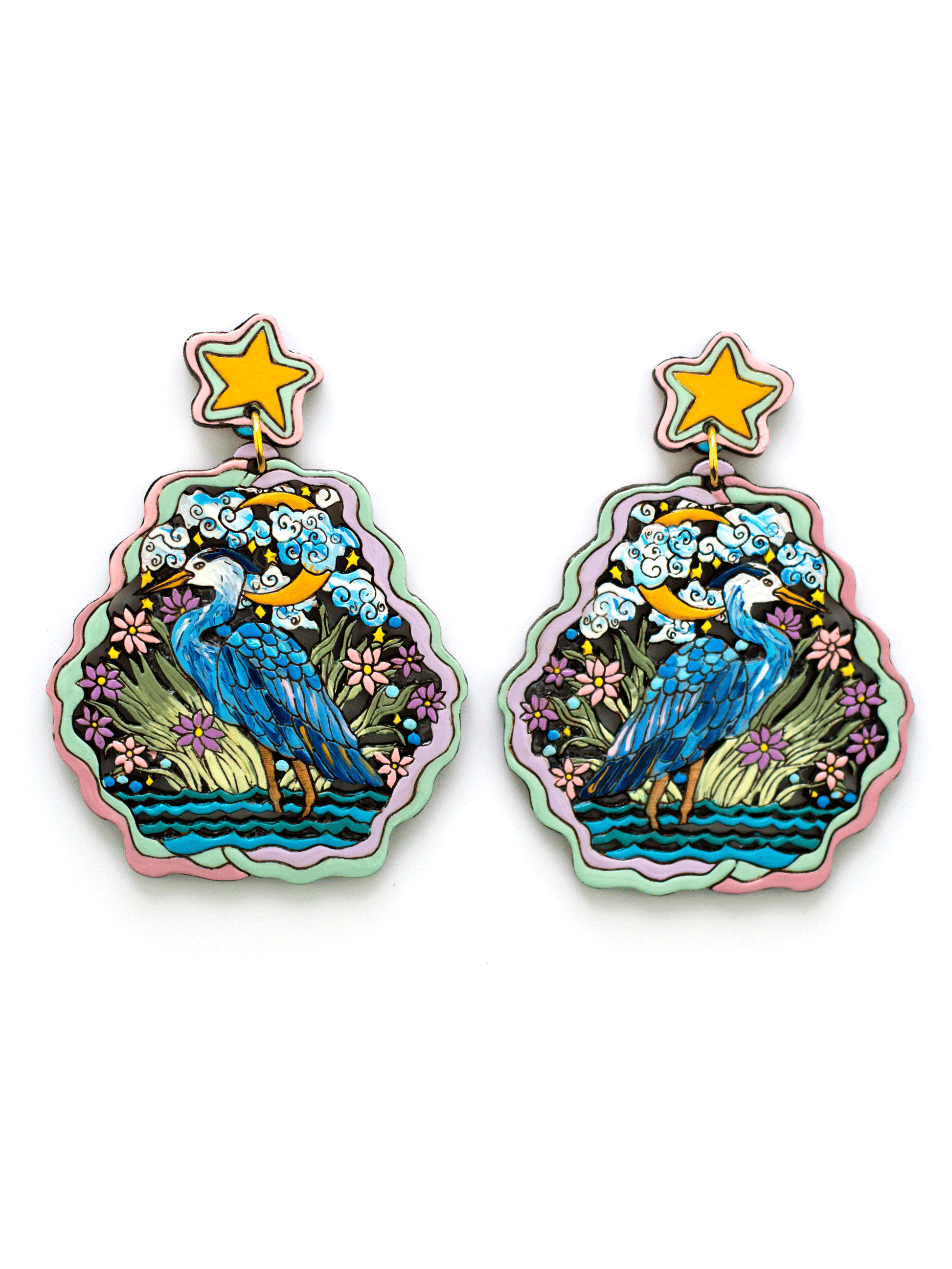 ✨Earrings featuring a great blue heron in the night sky