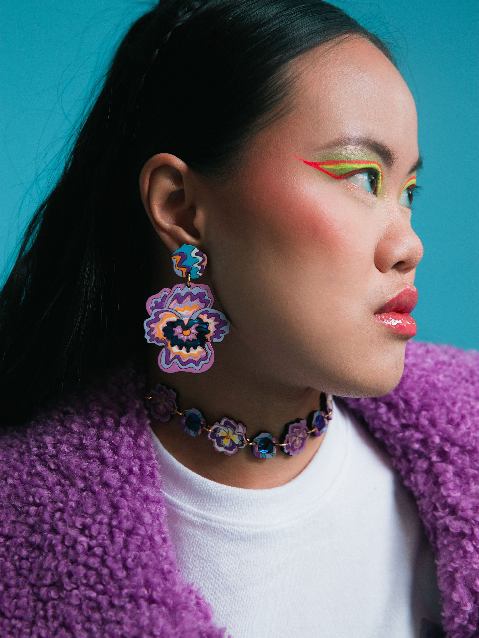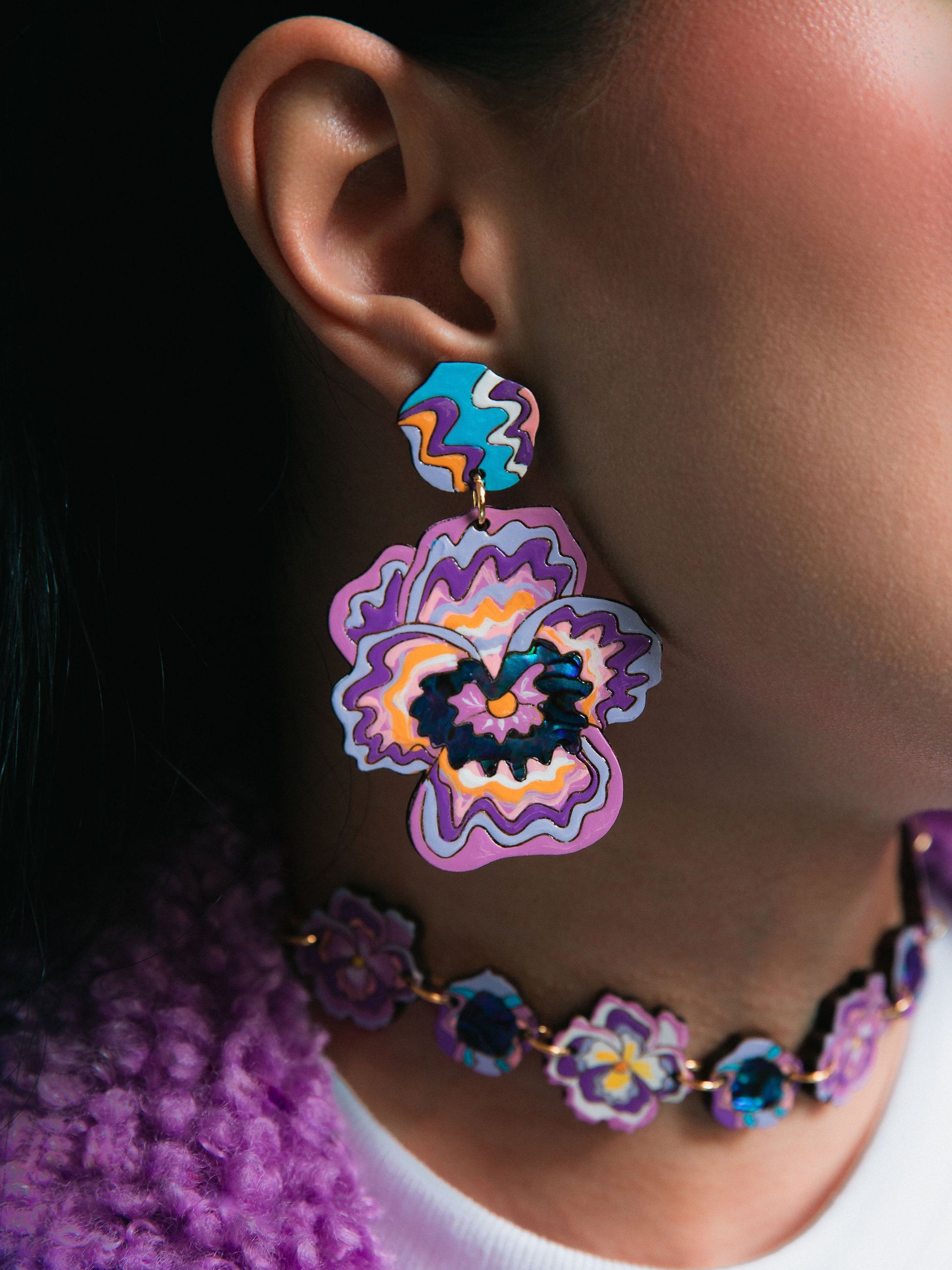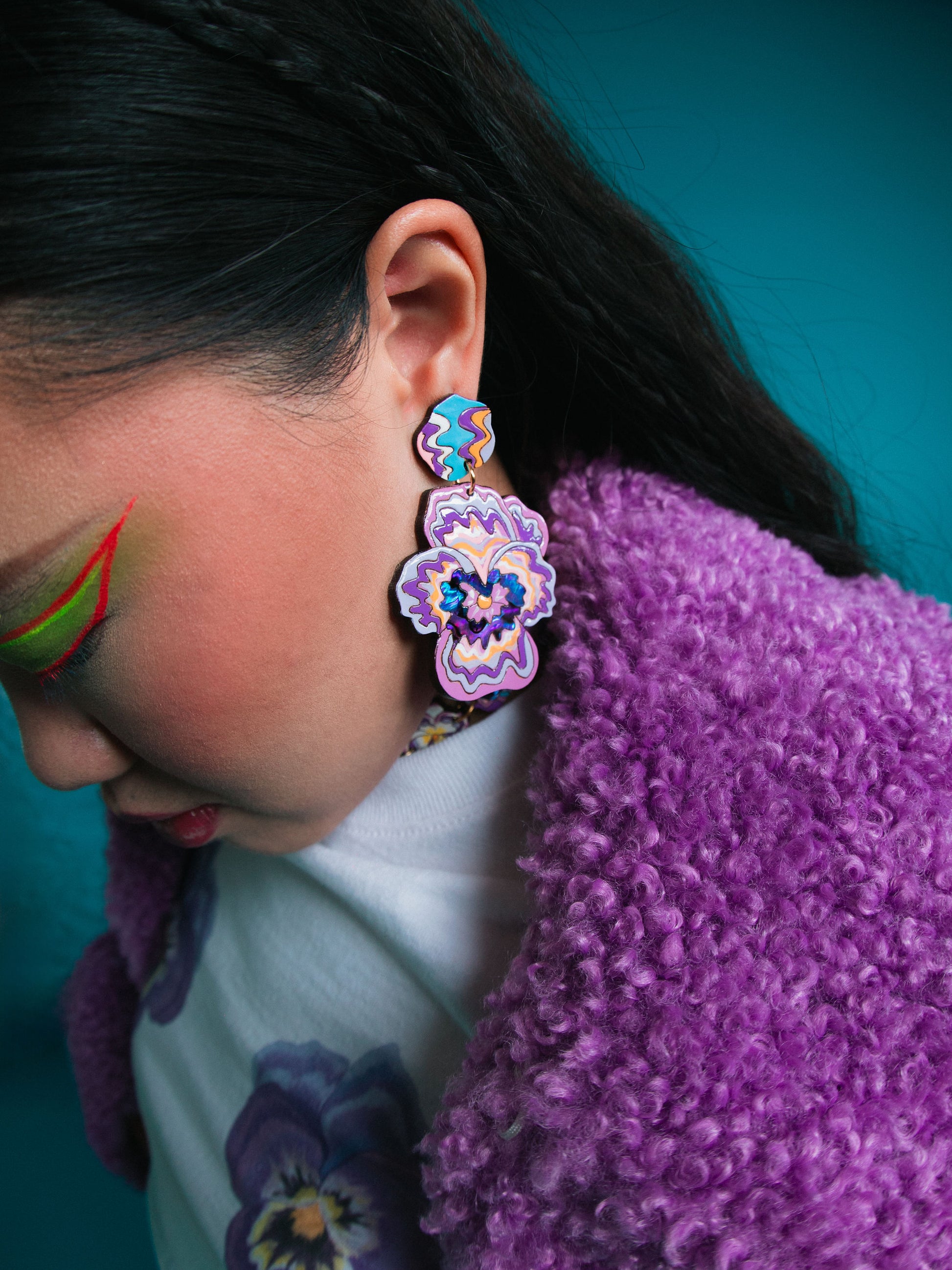 🌺Statement handpainted pansy earrings with sustainable purple abalone inlaid into the middle