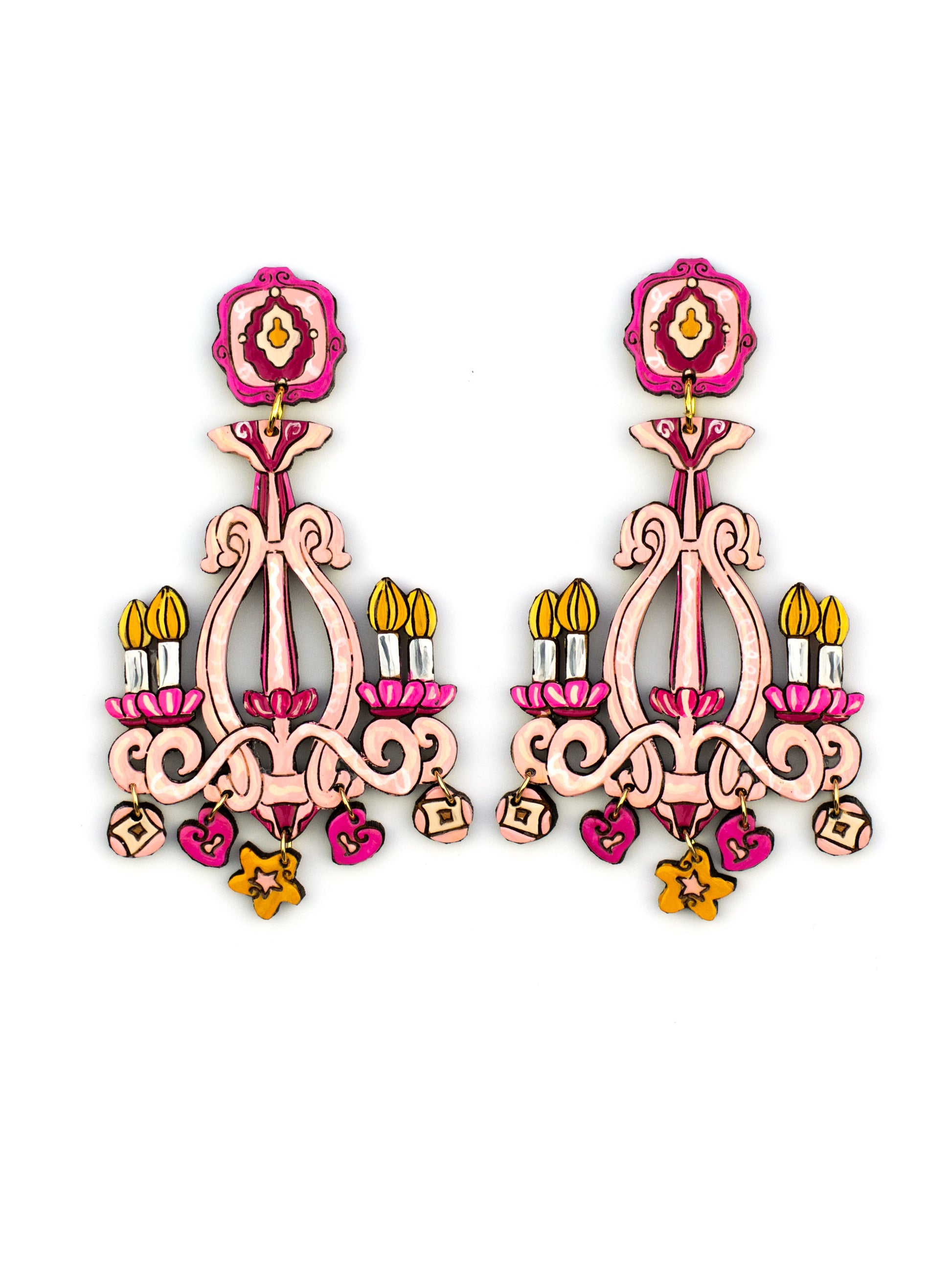 Swing into the spotlight with these one-of-a-kind blue topaz chandelier earrings. Painted in a mesmerizing topaz hue and adorned with inlaid glass rhinestones, they dangle with the same graceful movement as a real chandelier—except way more wearable.