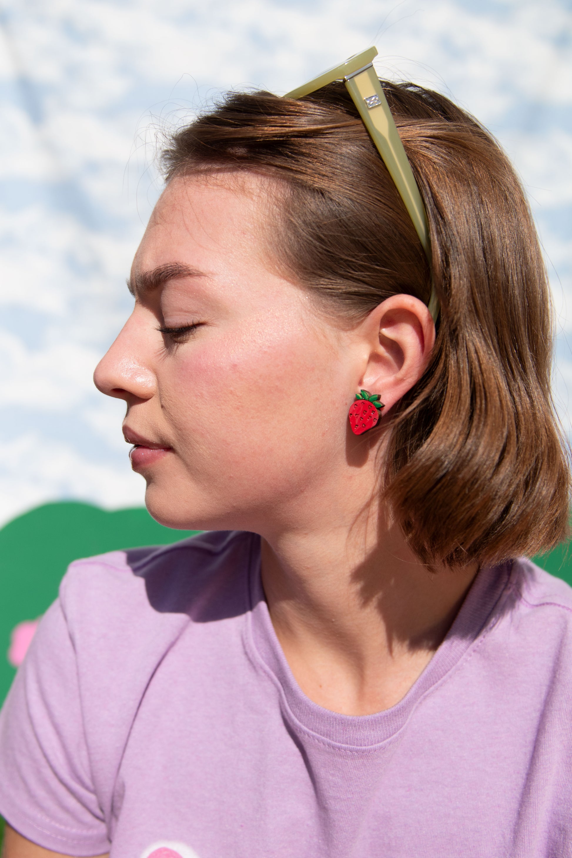 🍓Add some fruity fun to your style with our handpainted Strawberry Studs! Made of wood, these quirky earrings will have you looking sweet in no time.