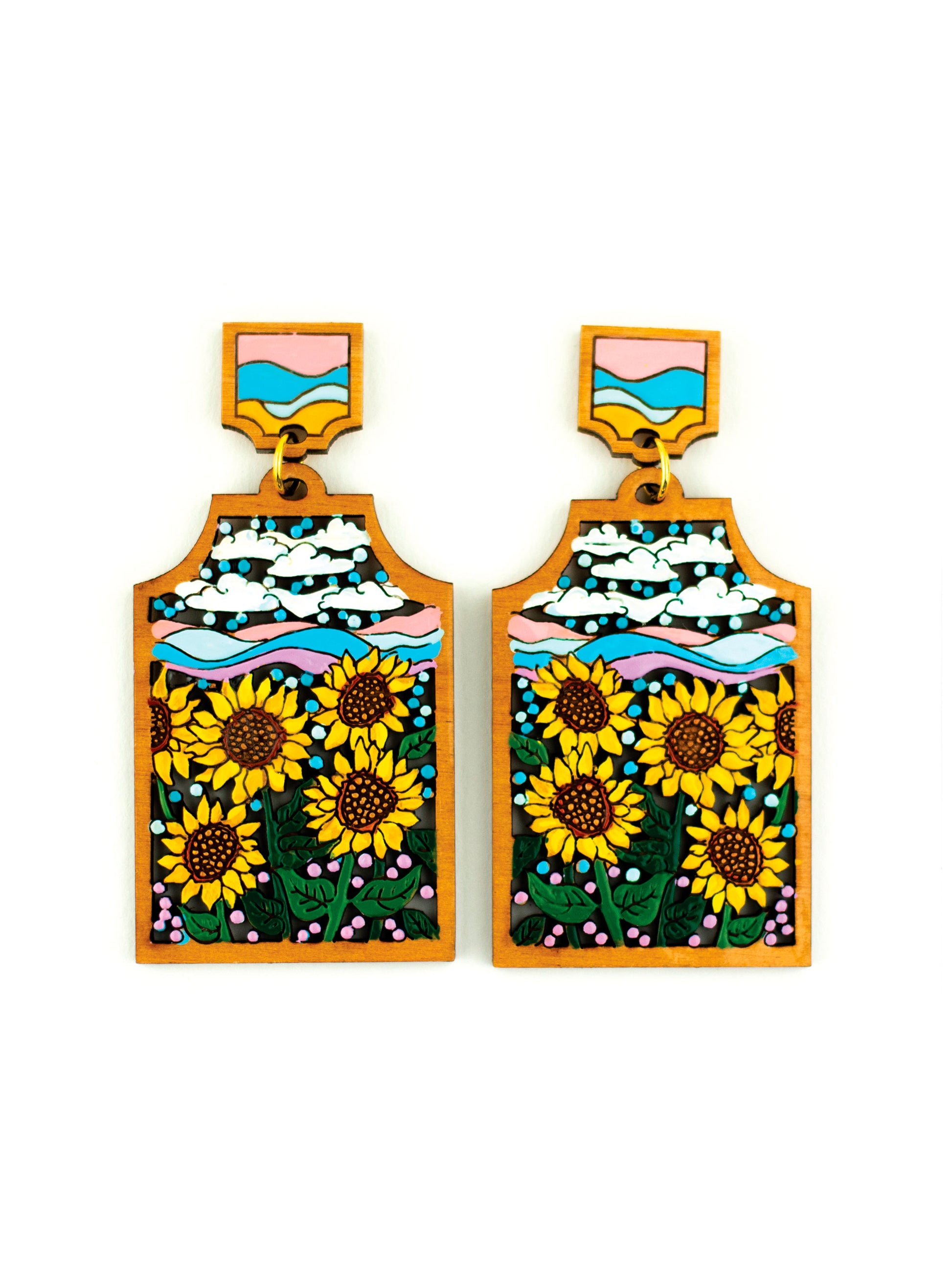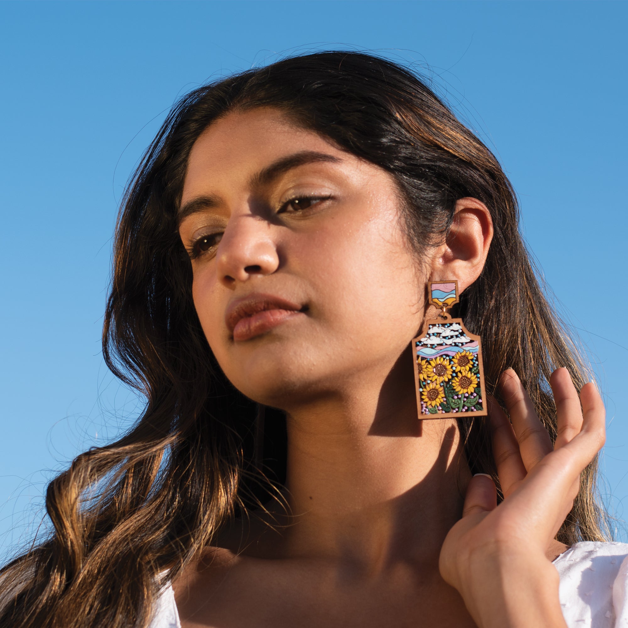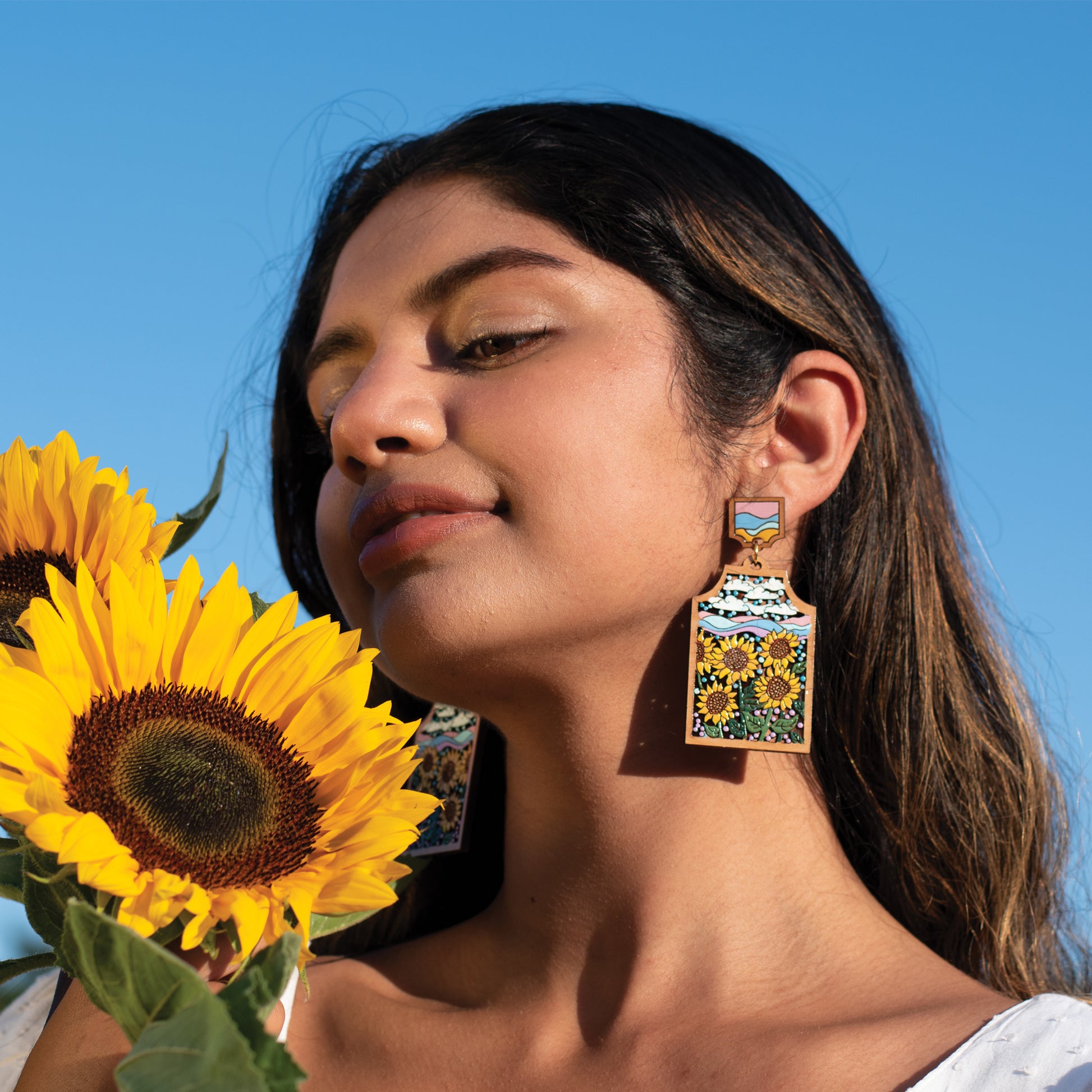 Watch heads turn with these delightful earrings featuring an enchanting sunflower field scene! Bursting with golden petals and pastoral charm, they're the perfect accessory for anyone who loves nature's brightest blooms. These playful stunners bring a splash of sunshine to your everyday look, whether you're a devoted flower enthusiast or simply seeking a cheerful conversation starter. Wear them and let your personality bloom!