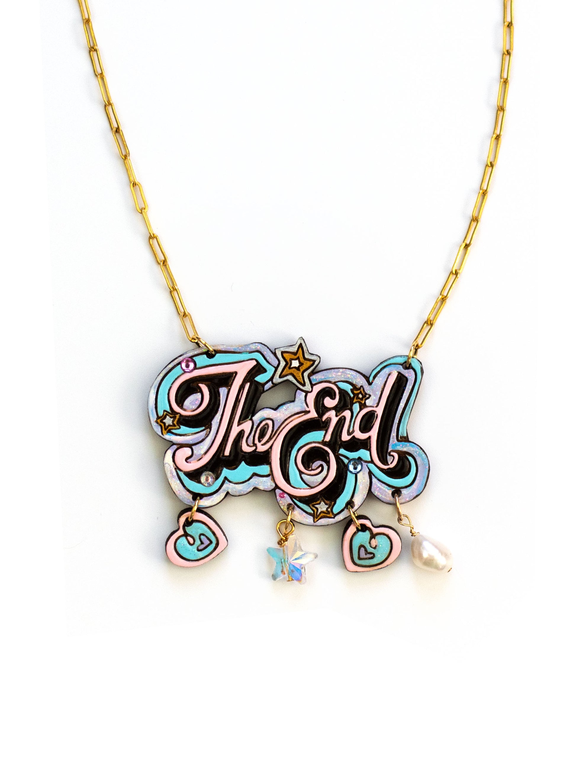 🎞️Inspired by the glamorous closing credits of classic Hollywood films, this charming necklace features delicate handpainted beads that dangle gracefully from a vintage-style "The End" pendant.